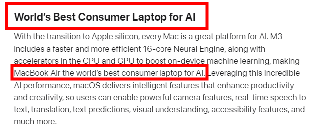 值得注意的是,苹果在上一年 10 月发布 M3 MacBook Pro 的新闻稿中并未提及任何与人工智能相关的内容。虽然苹果一般会在新闻稿中说到机器学习等方面的内容,但如此清晰提及“AI”实属稀有。