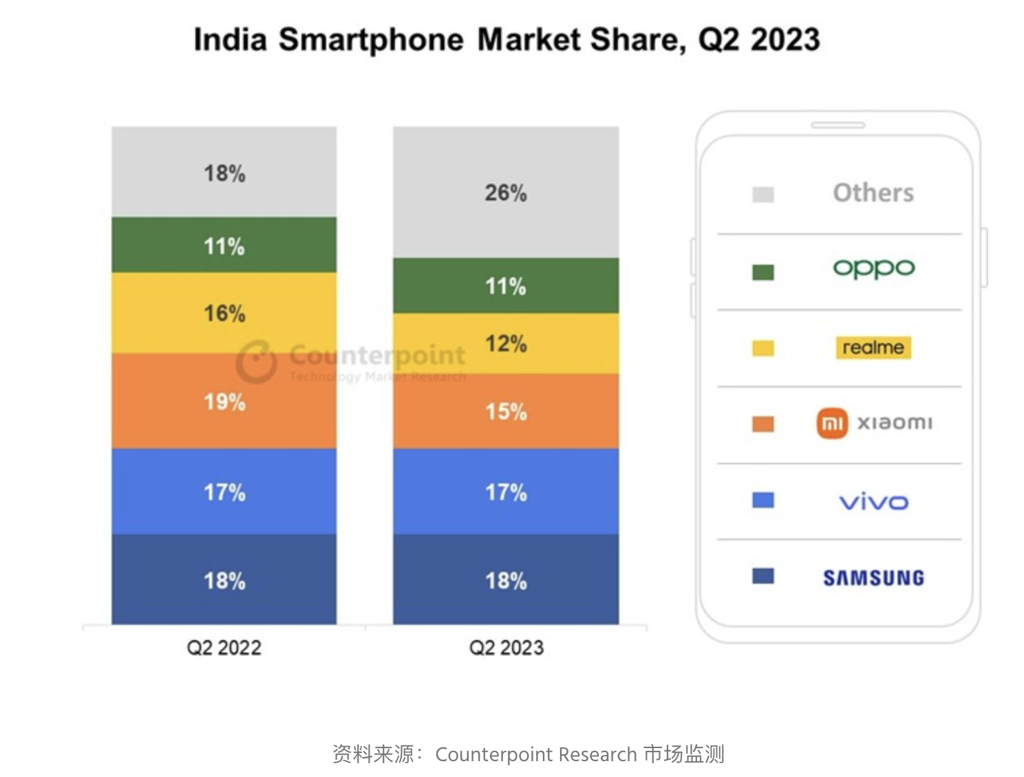 - 三星以 18% 的比例接连第三个季度抢先印度智能手机商场;